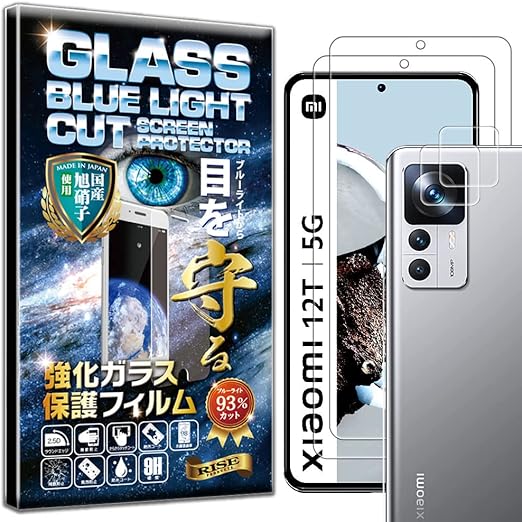 【対応機種及び仕様】Xiaomi 12T/Xiaomi 12T Pro ブルーライトカットガラスフィルム2枚+クリアカメラレンズ保護ガラスフィルム2枚セット。■ブルーライトカット率の高いガラス素材を使用。■安心の日本製素材 国産AGCガラスを使用。■第3世代製法の最新技術のW硬化製法(2次強化)ガラスで耐衝撃性を強化。