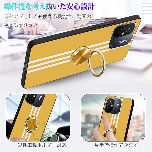 Xiaomi Redmi 12C ケースリング 耐衝撃 TPU 指紋防止 シリコン 車載ホルダー対応 360°回転 ストラップホール付き 滑り止め 落下防止 全面保護カバー(イエロー) a
