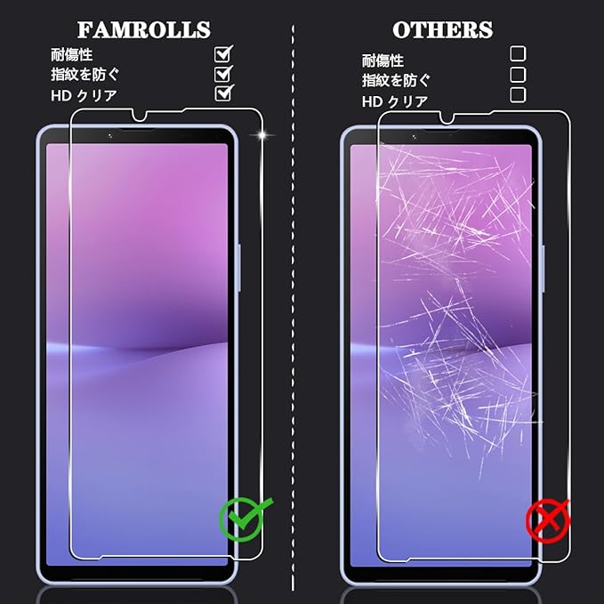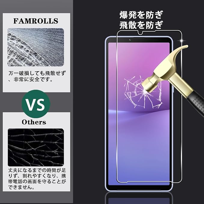 【対応機種】 Xperia 10 V 専用。素材に日本製の旭硝子を採用。【四枚セット】 2枚 用 Xperia 10 V SO-52D/SOG11 強化ガラスフィルム+ 2枚カメラ保護フィルム。【FAMROLLS正規品】スマホの周辺アクセサリーを長年手掛けるFAMROLLSメーカーの人気スマホガラスフィルムです。安心してご注文ください。