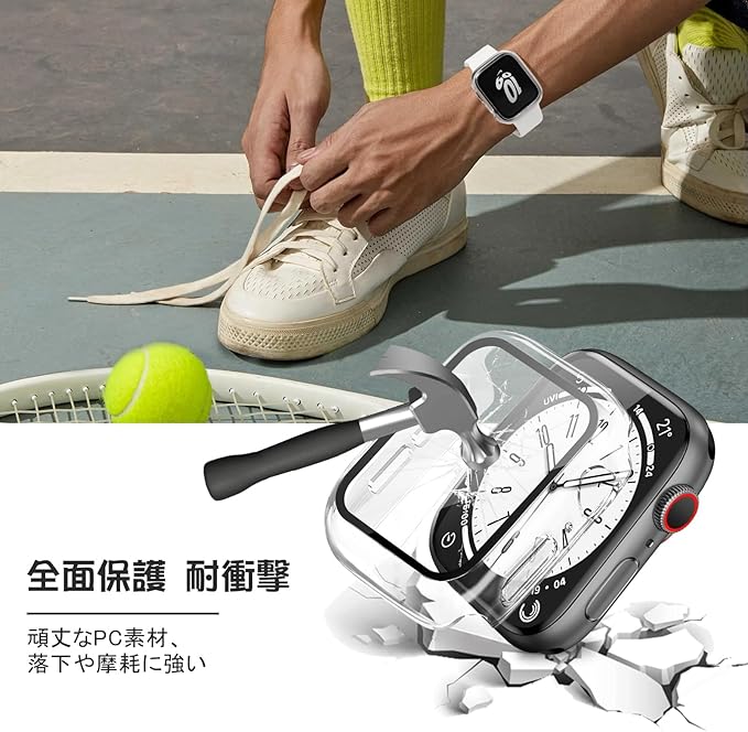 【全面保護】この製品はPC+ 強化ガラス素材を採用して、日常生活での衝撃から Watch を保護します。硬度 9H の強化ガラスで、超クリアな画面を提供して、なお画面の損傷を防止および回避し、 Watchをしかっり
