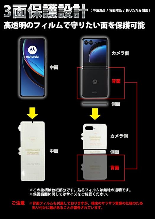 【 折り畳みに対応した3面保護設計 】 本製品は中面液晶、背面液晶、折り畳み側面部分を保護する3面保護設計です。