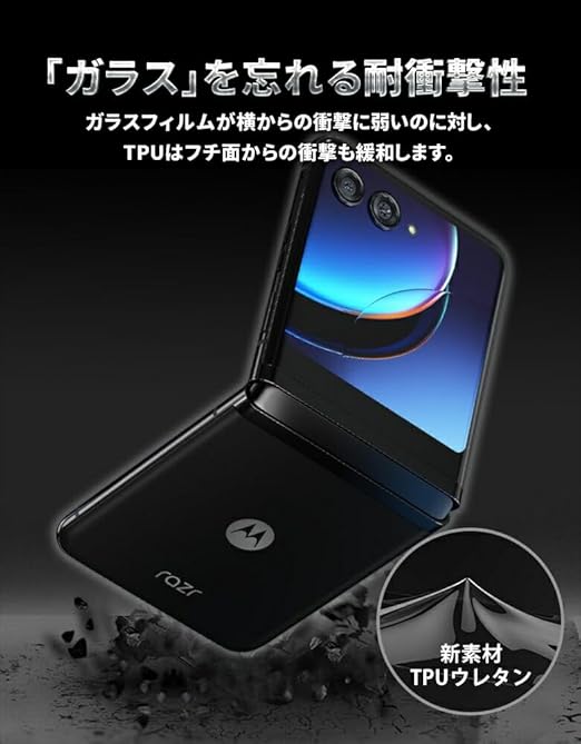 【 ガラスを忘れる耐衝撃 】 本製品に使用された新素材TPUはガラスと同等の耐衝撃性能を有しており、ガラスフィルムは横からの衝撃に弱いのに対し新素材TPUは側面からの衝撃も緩和することが出来ます。