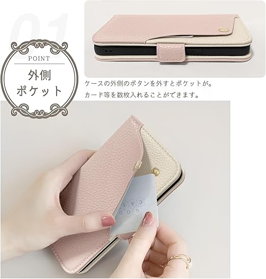 【カード収納&横置きスタンド機能】❶表面のボタン付きポケットが便利です。表のポケットの金具は飾りではなくスナップボタンで実用性があるし、内側に実用性のカード入れポケット×3、内側ポケット×1、カード類、現金