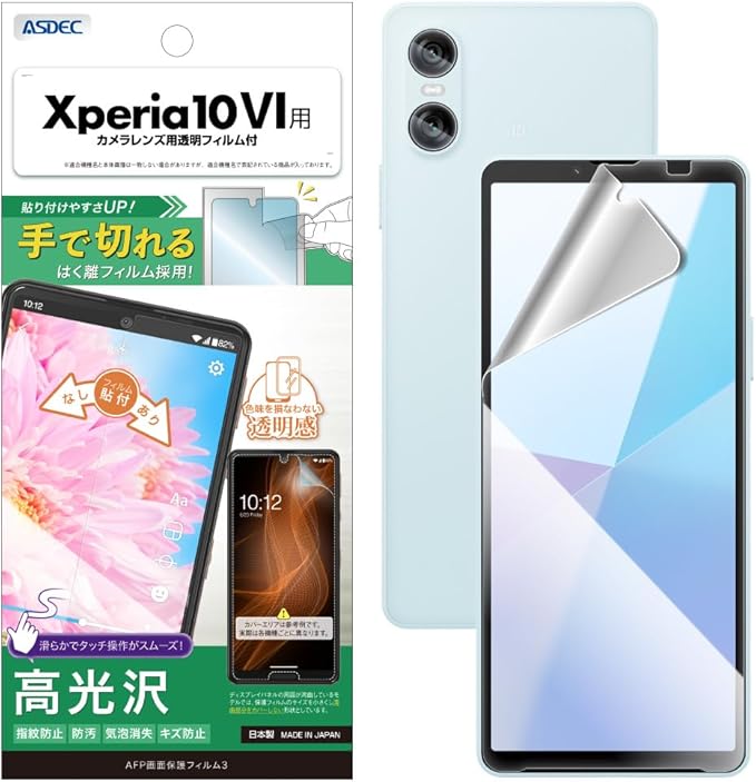 【ASDEC】Xperia 10 Ⅵ 用 光沢フィルム+カメラ保護フィルム「手で切れるはく離フィルム」クリア 日本製 指紋防止 防汚 気泡消失 ASH-SO52E-Z AFP画面保護フィルム3 a