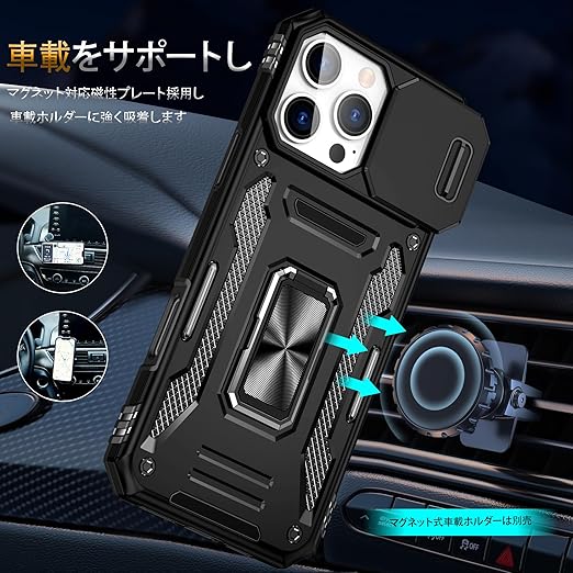 iPhone 16 Pro 用 ケース リング付き スライド式カメラカバー 耐衝撃 スタンド機能 車載ホルダー レンズ保護 アイフォン16プロ スマホケース PC TPUバンパー 防塵 人気 落下防止 滑り止め 指紋防止 携帯カバー 黒 K181 a