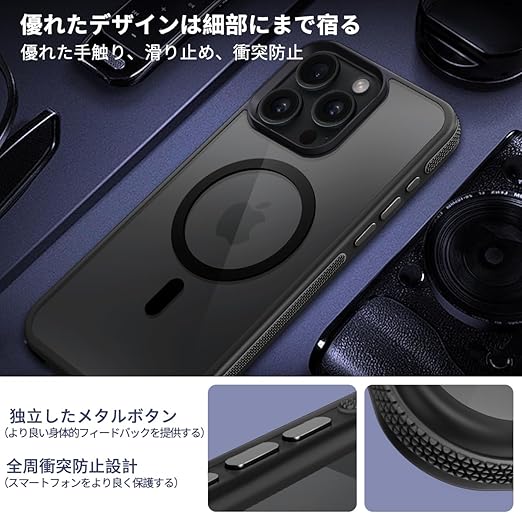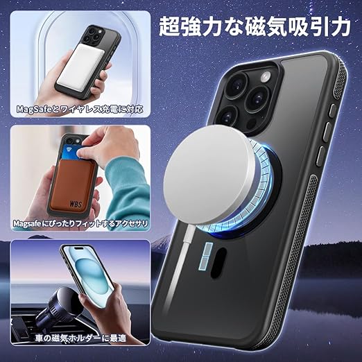 coiwantung iPhone 15 Pro MagSafe ケース 耐衝撃 滑り止め アイフォン 15Pro スマホケース 【新しい衝突防止ストリップ設計】[フォーインワン構造設計]米軍MIL規格 カバー 軽量 ワイヤレス充電対応 半透明 滑り止めエッジ 薄型 落下保護 (ブラック) a