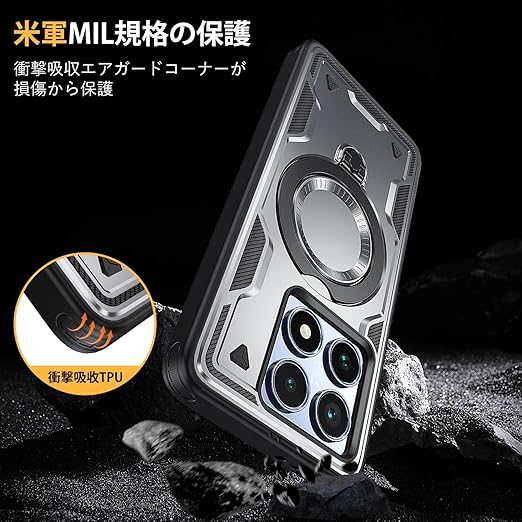 高品質素材:PC+TPU+金属リング;衝撃吸収性能の高いハードな"PC”素材をベースに、見た目のアクセントだけでなく、落下時の衝撃分散にも効果的な"TPU"素材のフレームを組み合わせました;軽量薄型、携帯電話本体とピッタリ密着しており、長く持っても手が疲れる感じもありません