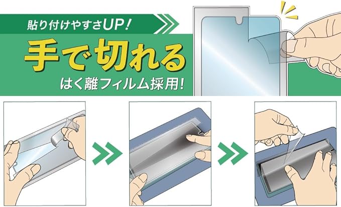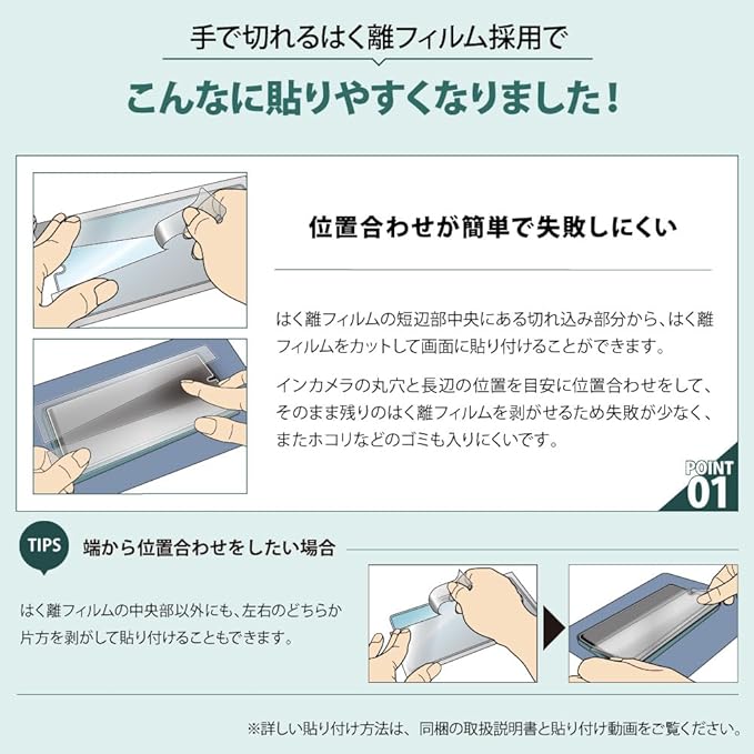 【手で切れるはく離フィルム】はく離フィルムの短辺部中央にある切れ込み部分から、簡単に手でカットすることが出来ます。