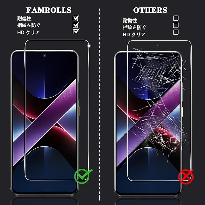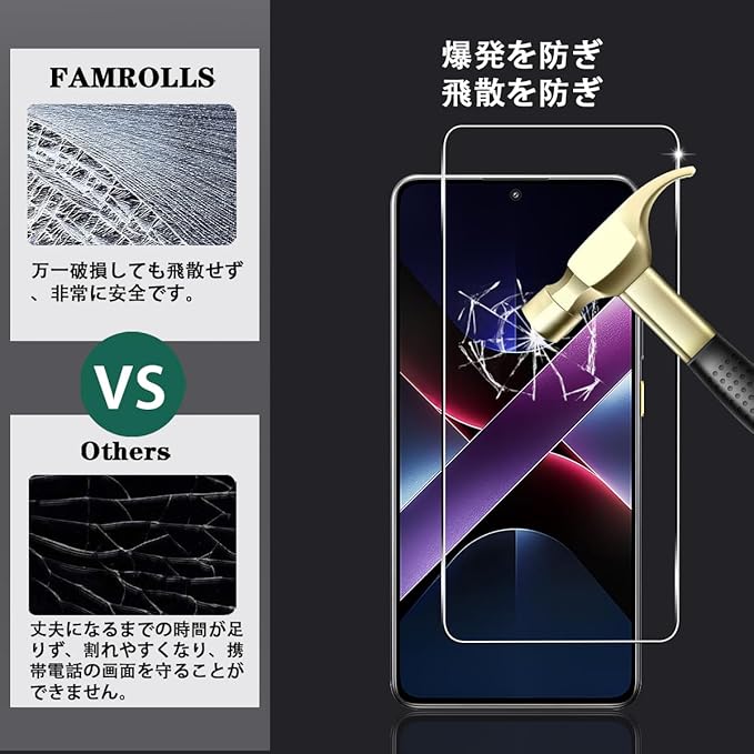 【対応機種】 Xiaomi POCO X7 Pro 専用。素材に日本製の旭硝子を採用。【四枚セット】 2枚 用 シャオミ POCO X7 Pro 強化ガラスフィルム+ 2枚カメラ保護フィルム。【FAMROLLS正規品】スマホの周辺アクセサリーを長年手掛けるFAMROLLSメーカーの人気スマホガラスフィルムです。安心してご注文ください。