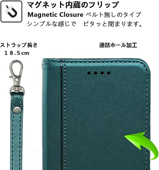 【機能性2:ストラップ付き】ストラップホール付きです。スマホカバーと同じの色合いを持つスプリングシャックル式のハンドストラップも同梱販売です。取替が易くて使い勝手が良いのです。ストラップの長さ:18.5cm。やは
