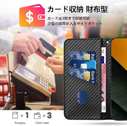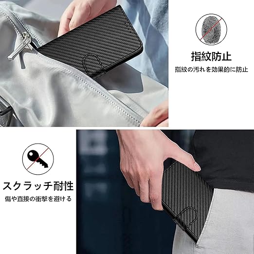 【上質な素材】このケースの外装は高品質のPU素材とカーボンファイバーの質感で作られており、手に馴染み、傷防止、指紋防止、優れた熱と衝撃吸収性を持っています。内側はソフトなTPU素材で携帯電話を保護し、着脱も簡単です。また、ケースは携帯電話