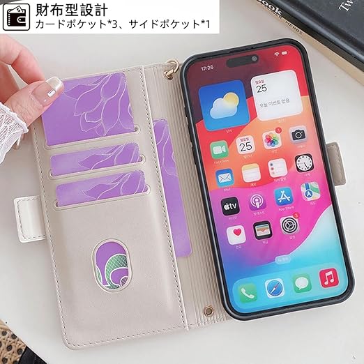 【機能性1:高品質PUレザー】外側のカバーには触感がとても良い高品質のPUレザーを採用します。内側のスマホホルダーは柔軟なTPU素材を採用したソフトケースです。耐衝撃の二重構造で落下の衝撃をうまく吸収し、本体をしっかりと守ります。フリップの表にゴールド色の金具を飾って、ユニークな高級感がアップします。