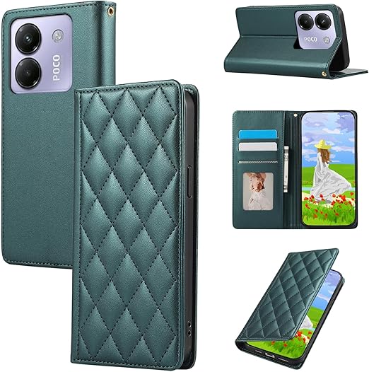 Gedurya POCO M7 Pro 5G 用 ケース 手帳型 シャオミ ポコm7プロ 5g ケース 携帯カバー RFIDブロッキング カード収納 財布型 Xiaomi POCO M7 Pro 5G スマホケース 6.67インチ対応 マグネット式 スタンド機能 全面保護 耐衝撃 ひし形 グリッド 刺繍 パターン - グリーン a