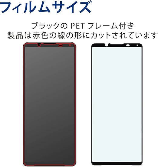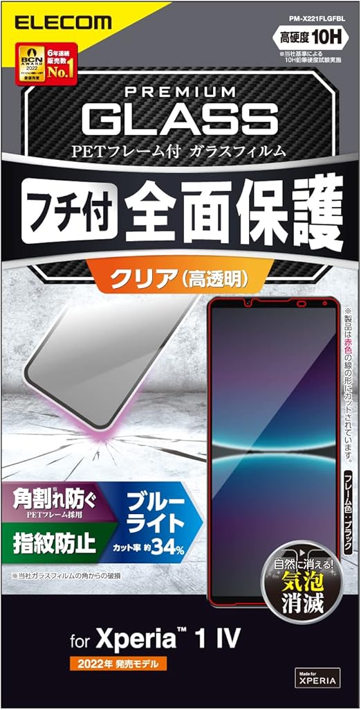 3D設計のPETフレームで角割れを防ぐブルーライトカットタイプのXperia 1 IV(SO-51C/SOG06)用フレーム付き液晶保護ガラスです。