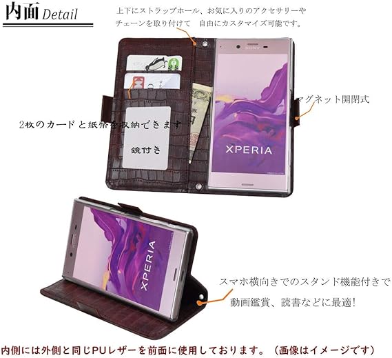 素材:PUレザー(内部ケース:ポリカーボネイト)、マグネット式ストラップの手帳型ケースがをしっかり固定して保護。内側には便利なポケット収納も。